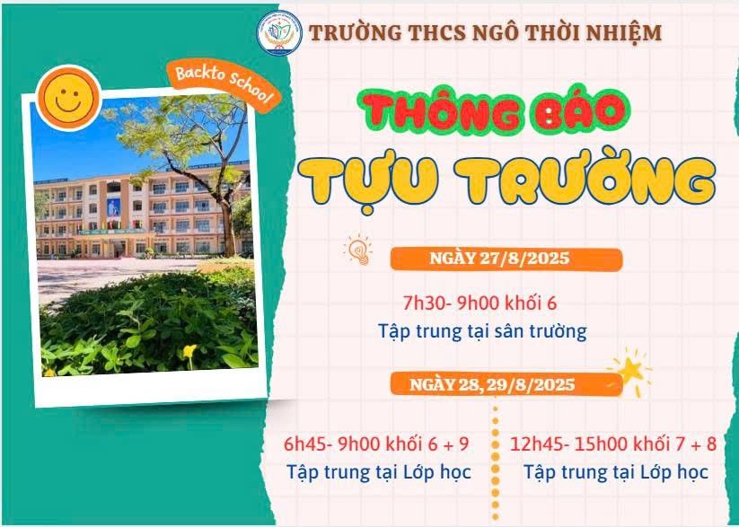 Một năm học mới lại sắp bắt đầu, hứa hẹn nhiều trải nghiệm và thành công mới. Nhà trường trân trọng thông báo lịch tập trung học sinh đầu năm học 2025-2026 (xem chi tiết bên dưới). Đề nghị học sinh mặc đồng phục và có mặt đúng giờ. Chúng ta hãy cùng nhau khởi đầu năm học mới với tinh thần hăng say và quyết tâm chinh phục tri thức!
